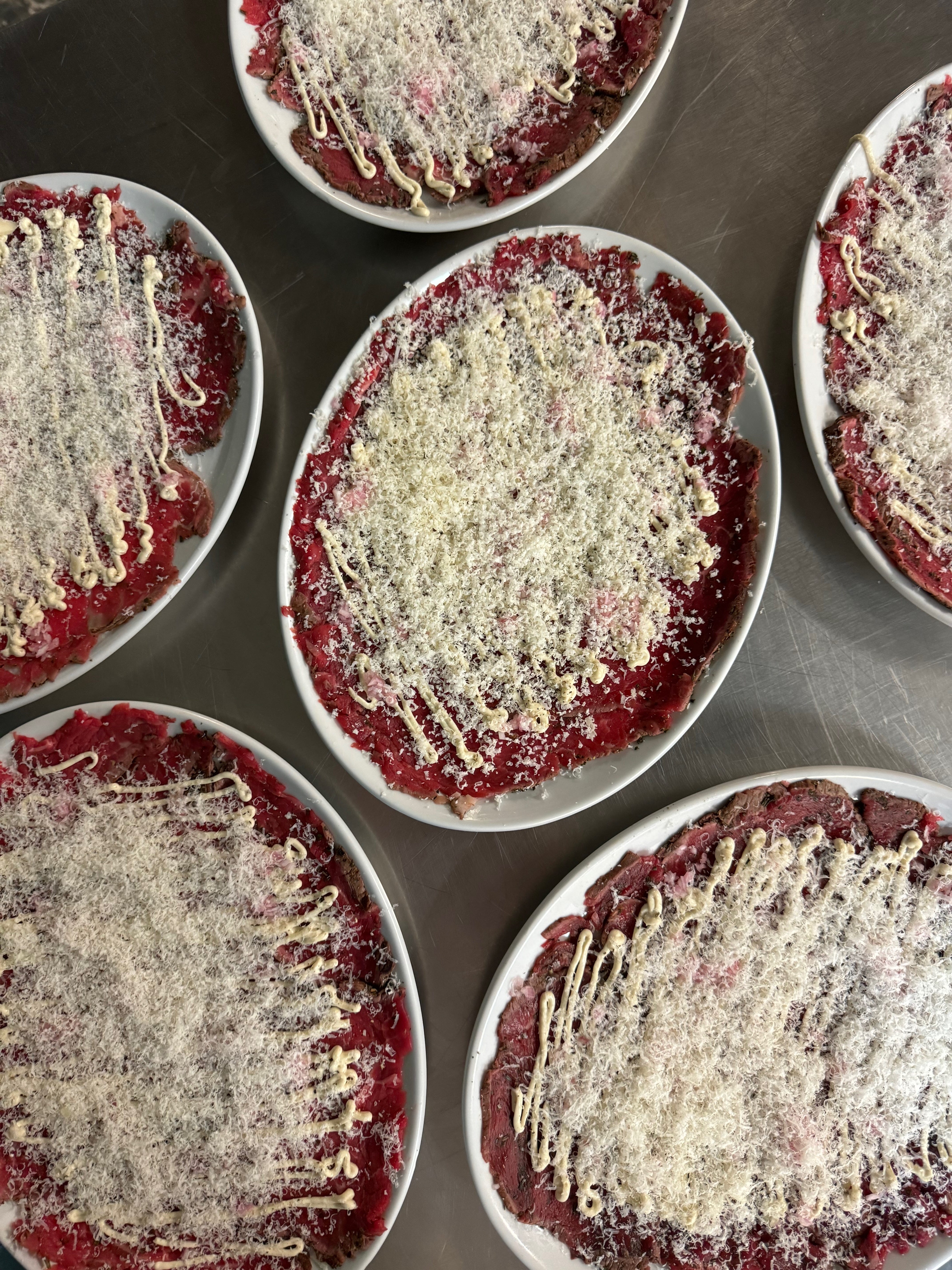 Preparing beef for tartar offers the most opportunity to tenderise tougher cuts as you can chop and ‘break’ the grain more effectively. Some tartars even put the beef through a mincer to really break down those tougher proteins. For carpaccio, you’re taking cuts of the meat in its organic form, so it needs to be tender in the first place. Enter, fillet.