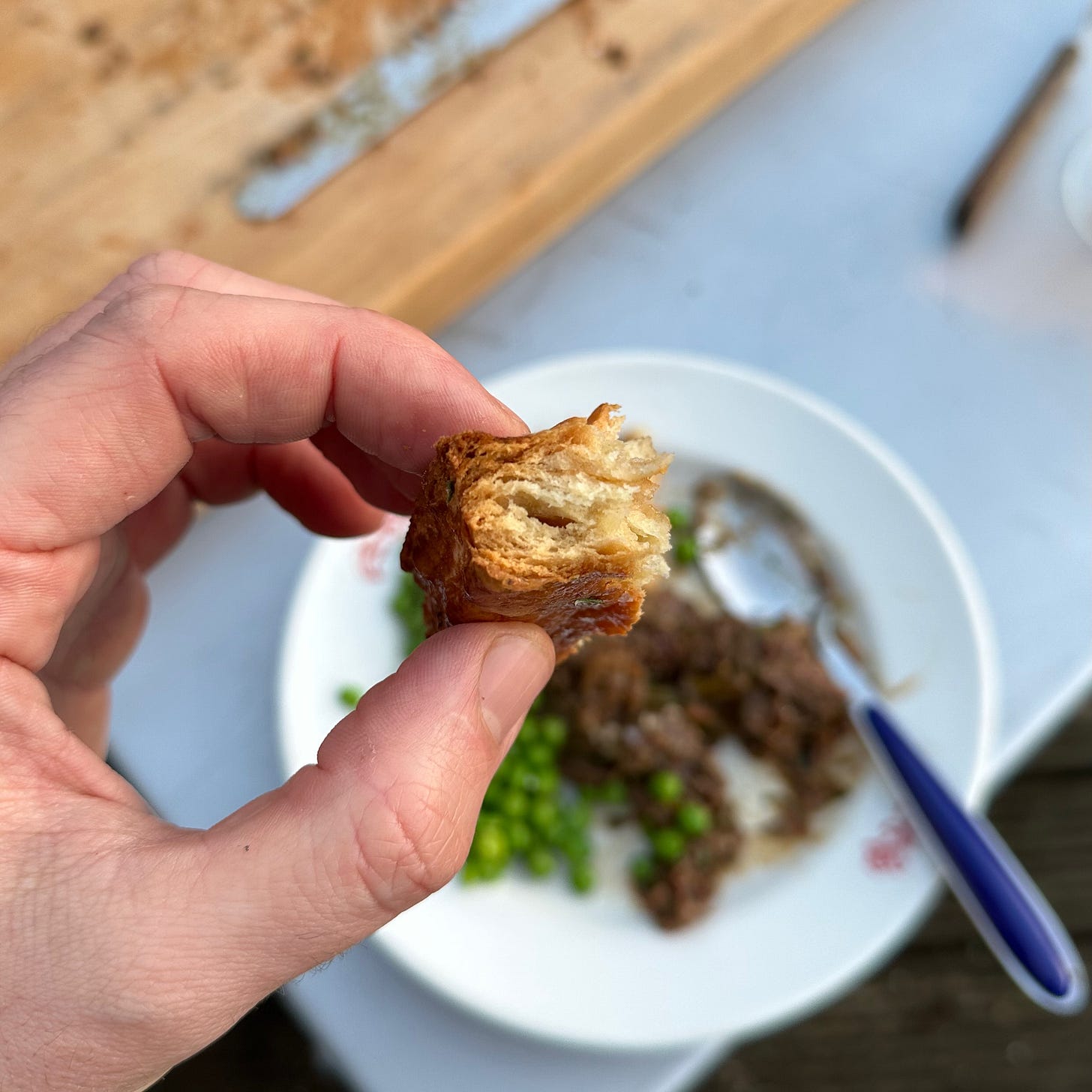 Atora suet comes in a little bag, formed into small pellets. You tip that into a bowl with flour and use your fingertips to rub the whole lot together until it’s got a sandy texture. My instinct was to leave a few pellets whole to encourage some extra puff, but Will’s tip was to fully rub the pellets into the flour. This way you’ll achieve a much stronger, more uniform pastry that’ll stand up to a big beefy filling. See above for proof that Will’s pastry is flaky, puffed and delicious.