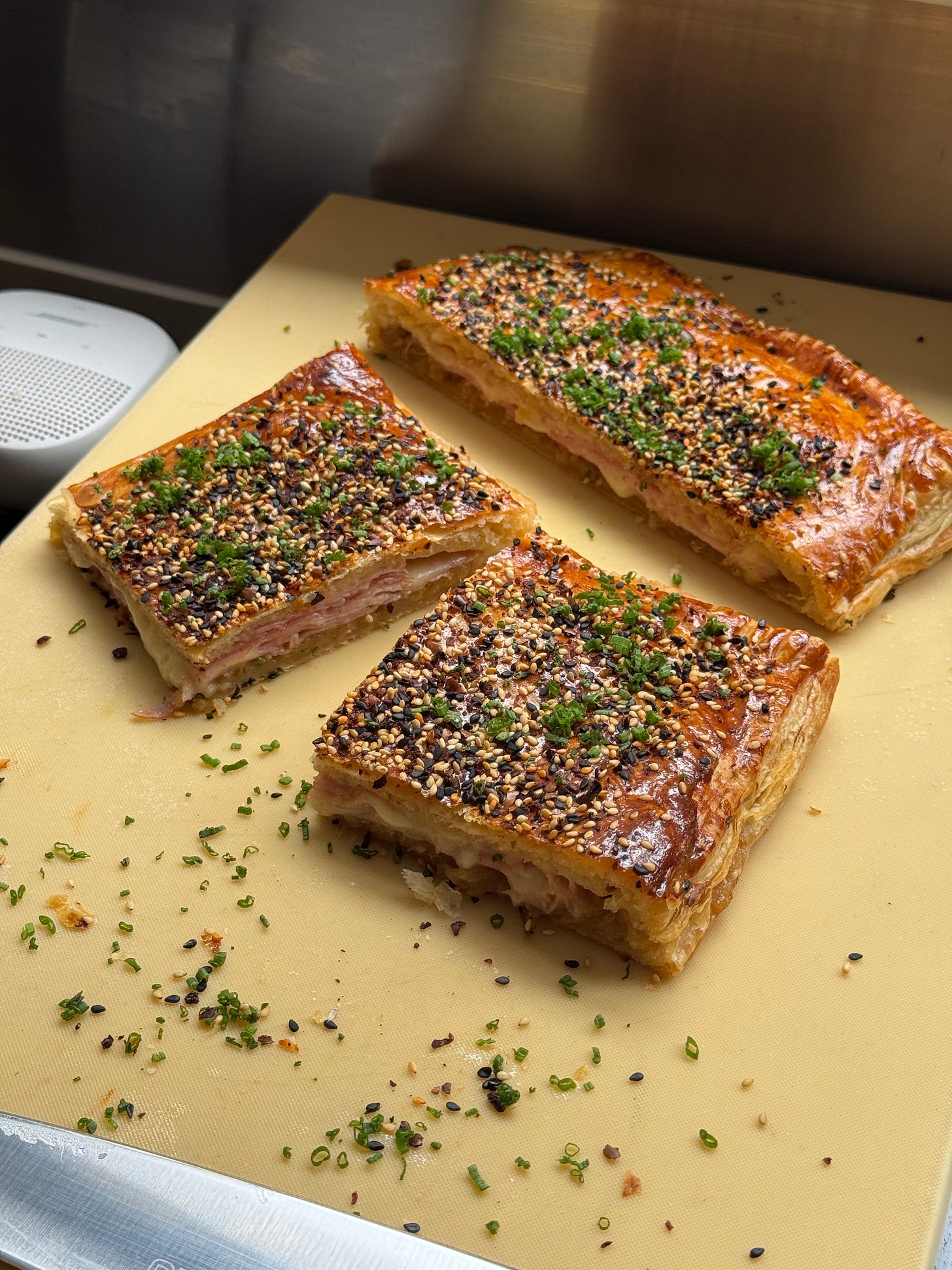 If you go boob-mode with your pithivier, you can stuff it with all sorts, but I guarantee ham and cheese would be very weird. Imagine, a big, clumsy ball of ham, caramelised onions and comté - it’s just wrong! We want layer after layer of crisp pastry, thinly sliced ham, oozy cheese, gooey onions and fragrant spices. This time, a big flat pie just makes sense.