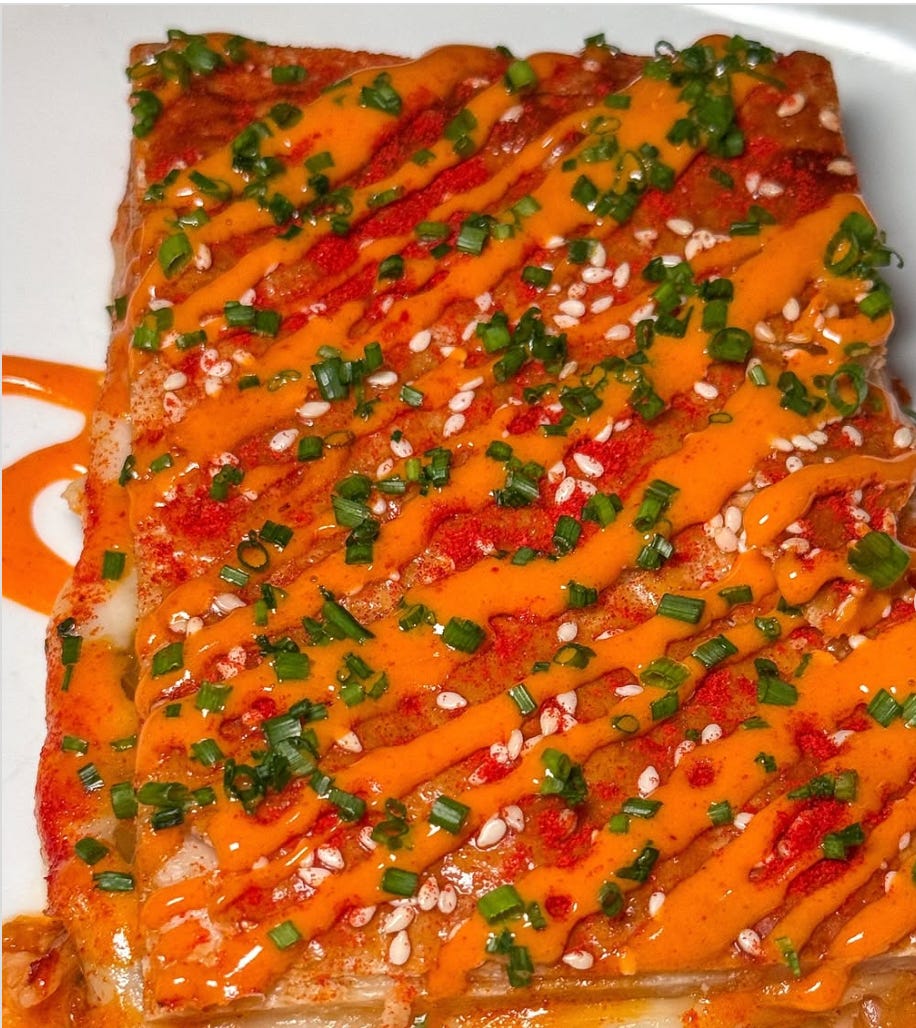 Whilst I haven’t been to Wildair IRL, via the brain-melting lens of instagram, I am very familiar with the food they cook and in particular, a baked good. What really catches my eye is their pithiviers. When I first saw a slice of golden, flaky pastry, covered in a bright, ferrari-red mayonnaise, I was sure I wasn’t looking at a pithivier or a steak bake stuffed with kimchi. Either way, I knew I wanted to eat it. They’re turning out some seriously good looking flavours across the pond. Kimchi ricotta, ham and cheese, broccoli rabe and chilli jam. Woof.
