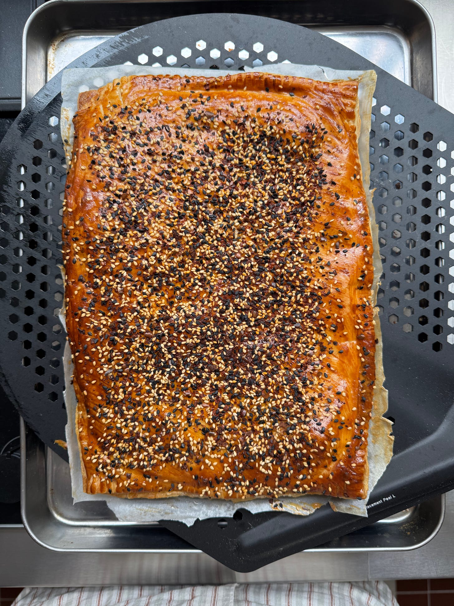 A big fat posh pie, known as a pithivier. I’ve made a heap of these over the years, and for the most part they’ve been big and round and a pain in the ass to make... This one’s a little different, mostly because it’s very easy, but also because it’s a big flat rectangle.