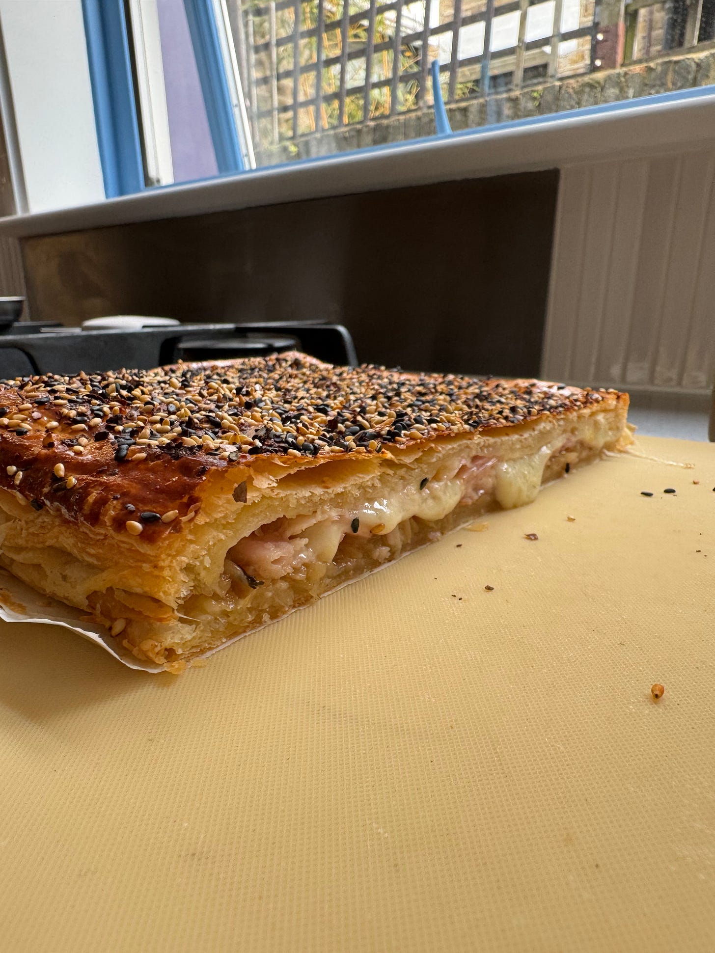 We’ve got the three amigos ready to go, good cheese, wafer thin ham and a dollop of jammy, sweet and sour Lyonnaise onions. What are our final little tweaks? Well, baking seeds and spices on top a pie is a great way to add a little extra texture and fragrance. I’ve gone for a blend of fennel, chilli and sesame here but you could go for whatever you like! Nigella seeds rip on a baked good and an “everything bagel” seasoning rarely misses.